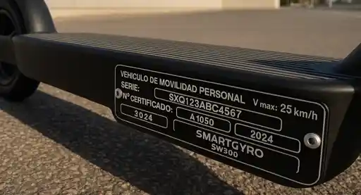 Busca en tu patinete una placa similar a la de la imagen, en la misma podrás encontrar el código del certificado de homologación. Después consulta en nuestra pagina si ese código existe en la lista oficial de la DGT.